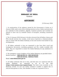 ਭਾਰਤ ਨੇ ਈਰਾਨ ਵਿੱਚ ਰਹਿਣ ਵਾਲੇ ਭਾਰਤੀ ਨਾਗਰਿਕਾਂ ਲਈ ਨਵੇਂ ਦਿਸ਼ਾ-ਨਿਰਦੇਸ਼ ਜਾਰੀ ਕੀਤੇ ਹਨ। ਰਿਪੋਰਟਾਂ ਦੇ ਅਨੁਸਾਰ, ਸੋਮਵਾਰ, 23 ਫਰਵਰੀ ਨੂੰ ਜਾਰੀ ਕੀਤੀ ਗਈ ਇੱਕ ਐਡਵਾਈਜ਼ਰੀ ਵਿੱਚ ਈਰਾਨ ਵਿੱਚ ਆਪਣੇ ਸਾਰੇ ਨਾਗਰਿਕਾਂ ਨੂੰ ਆਵਾਜਾਈ ਦੇ ਕਿਸੇ ਵੀ ਉਪਲਬਧ ਸਾਧਨ ਦੀ ਵਰਤੋਂ ਕਰਕੇ ਦੇਸ਼ ਛੱਡਣ ਦੀ ਅਪੀਲ ਕੀਤੀ ਗਈ ਹੈ।ਇਹ ਐਡਵਾਈਜ਼ਰੀ ਮੱਧ ਪੂਰਬ ਵਿੱਚ ਜੰਗ ਦੇ ਵਧਦੇ ਡਰ ਅਤੇ ਤਹਿਰਾਨ ਅਤੇ ਵਾਸ਼ਿੰਗਟਨ ਵਿਚਕਾਰ ਵਧਦੇ ਤਣਾਅ ਦੇ ਵਿਚਕਾਰ ਆਈ ਹੈ। ਤਹਿਰਾਨ ਵਿੱਚ ਭਾਰਤੀ ਦੂਤਾਵਾਸ ਦੇ ਅਨੁਸਾਰ, ਨਵੀਂ ਸਲਾਹ “ਈਰਾਨ ਵਿੱਚ ਵਿਕਸਤ ਹੋ ਰਹੀ ਸਥਿਤੀ ਦੇ ਮੱਦੇਨਜ਼ਰ” ਜਾਰੀ ਕੀਤੀ ਗਈ ਹੈ।ਐਡਵਾਈਜ਼ਰੀ ਵਿੱਚ ਕਿਹਾ ਗਿਆ ਹੈ, “14 ਜਨਵਰੀ, 2026 ਦੀ ਸਲਾਹ ਦੁਹਰਾਉਂਦੀ ਹੈ ਕਿ ਸਾਰੇ ਭਾਰਤੀ ਨਾਗਰਿਕਾਂ ਅਤੇ ਪੀਆਈਓ ਨੂੰ ਸਾਵਧਾਨੀ ਵਰਤਣੀ ਚਾਹੀਦੀ ਹੈ, ਵਿਰੋਧ ਪ੍ਰਦਰਸ਼ਨਾਂ ਜਾਂ ਪ੍ਰਦਰਸ਼ਨਾਂ ਵਾਲੀਆਂ ਥਾਵਾਂ ‘ਤੇ ਜਾਣ ਤੋਂ ਬਚਣਾ ਚਾਹੀਦਾ ਹੈ, ਈਰਾਨ ਵਿੱਚ ਭਾਰਤੀ ਦੂਤਾਵਾਸ ਦੇ ਸੰਪਰਕ ਵਿੱਚ ਰਹਿਣਾ ਚਾਹੀਦਾ ਹੈ, ਅਤੇ ਕਿਸੇ ਵੀ ਘਟਨਾਕ੍ਰਮ ਲਈ ਸਥਾਨਕ ਮੀਡੀਆ ਦੀ ਨਿਗਰਾਨੀ ਕਰਨੀ ਚਾਹੀਦੀ ਹੈ।ਤਹਿਰਾਨ ਵਿੱਚ ਭਾਰਤੀ ਦੂਤਾਵਾਸ ਨੇ ਈਰਾਨ ਵਿੱਚ ਸਾਰੇ ਭਾਰਤੀ ਨਾਗਰਿਕਾਂ ਨੂੰ ਬੇਨਤੀ ਕੀਤੀ ਹੈ ਕਿ ਉਹ ਆਪਣੇ ਇਮੀਗ੍ਰੇਸ਼ਨ ਅਤੇ ਯਾਤਰਾ ਦਸਤਾਵੇਜ਼, ਜਿਵੇਂ ਕਿ ਆਈਡੀ ਅਤੇ ਪਾਸਪੋਰਟ, ਆਪਣੇ ਕੋਲ ਰੱਖਣ ਅਤੇ ਕਿਸੇ ਵੀ ਸਹਾਇਤਾ ਲਈ ਦੂਤਾਵਾਸ ਨਾਲ ਸੰਪਰਕ ਕਰਨ। ਦੂਤਾਵਾਸ ਨੇ ਐਮਰਜੈਂਸੀ ਹੈਲਪਲਾਈਨ ਨੰਬਰ ਵੀ ਜਾਰੀ ਕੀਤੇ ਹਨ: +989128109115; +989128109109; +989128109102; +989932179359।