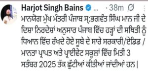 ਪੰਜਾਬ ਵਿੱਚ ਹੜਾਂ ਨੂੰ ਮੱਦੇ ਨਜ਼ਰ ਰੱਖਦੇ ਹੋਏ 3 ਸਤੰਬਰ ਤੱਕ ਸਾਰੇ ਸਕੂਲਾਂ ਵਿੱਚ ਛੁੱਟੀ ਦਾ ਐਲਾਨ